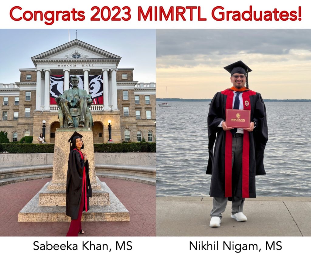 Congratulations to MIMRTL graduate students Sabeeka Khan (LinkedIn: https://www.linkedin.com/in/sabeeka-khan/) and Nikhil Nagam (LinkedIn: https://www.linkedin.com/in/nikhil-nigam-31131b12a/). Both recently graduated with Masters’ degrees in the Department of Electrical and Computer Engineering. We look forward to seeing the great things that you accomplish. Congrats to Sabeeka and Nikhil!